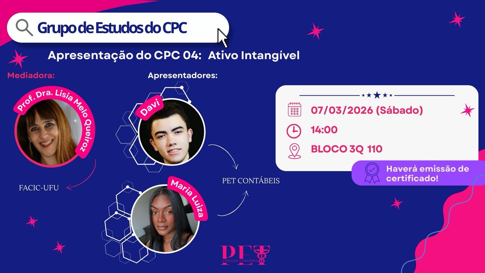 O encontro contará com a apresentação do pronunciamento contábil pelos petianos Davi e Maria Luiza, resolução de exercícios práticos e espaço para dúvidas e debates.